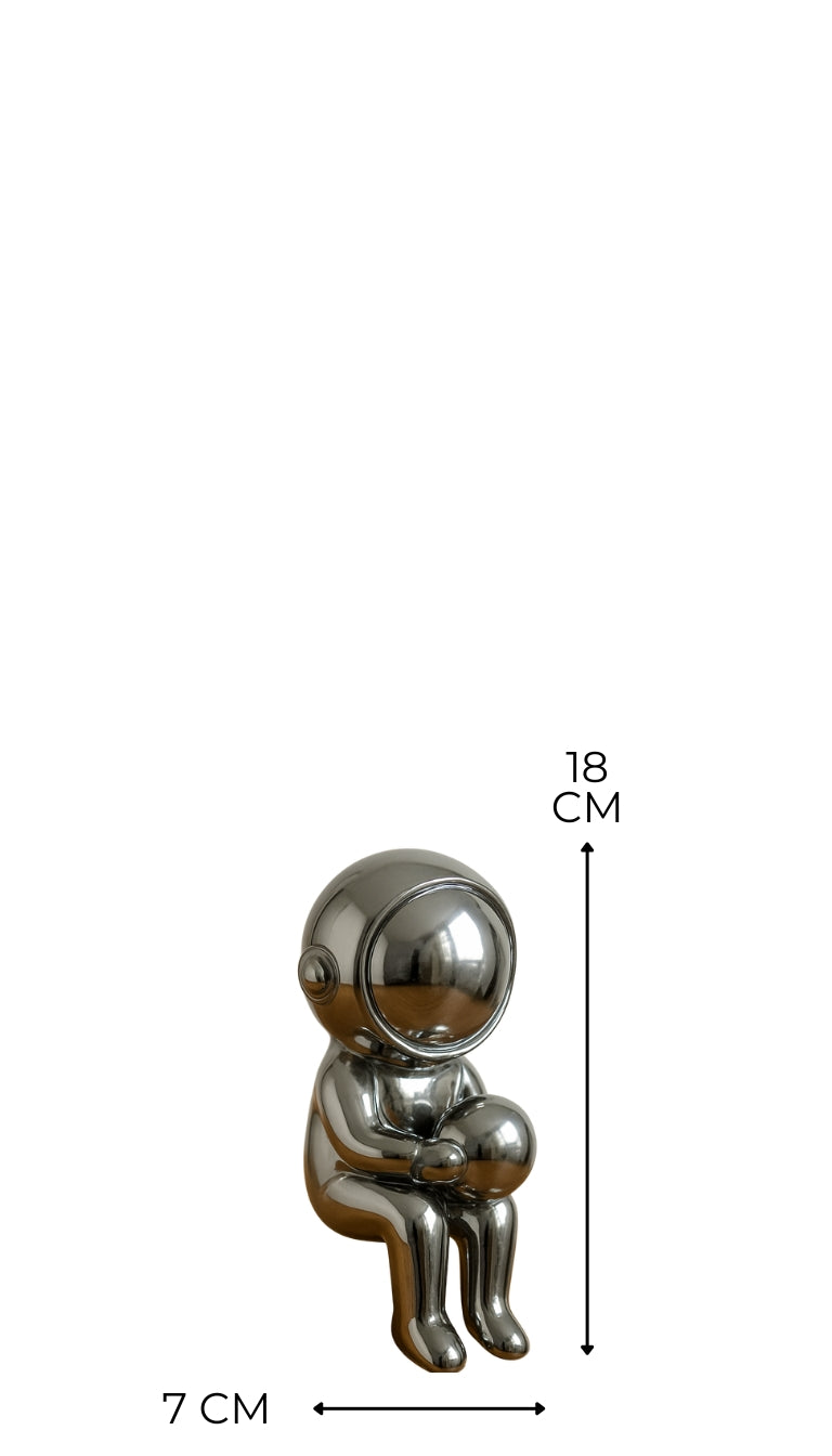 A sleek metallic astronaut figurine symbolizing exploration and curiosity. Perfect for modern interiors, office desks, or shelves. Adding a futuristic and reflective touch to any space.
