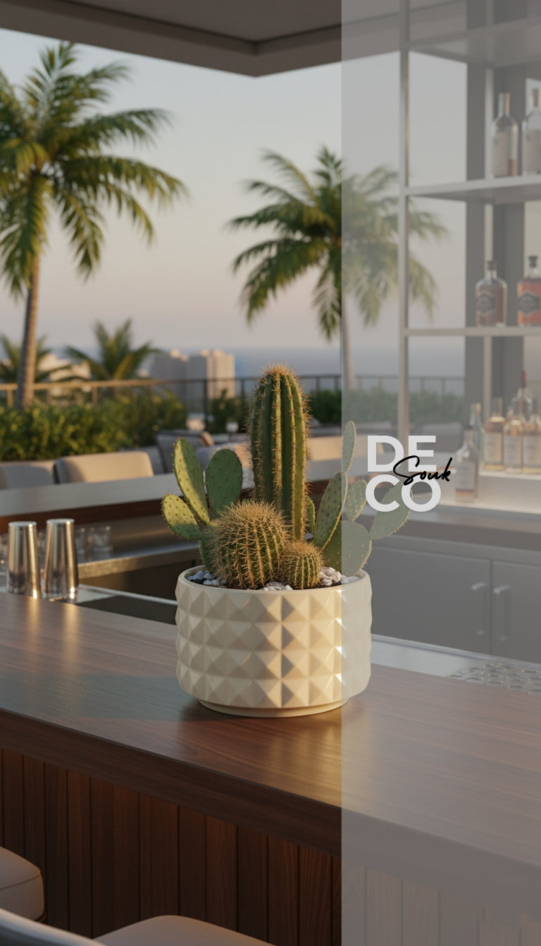 This is a low, wide bowl-shaped planter with a distinctive, three-dimensional geometric texture. The entire exterior surface is covered in a uniform diamond or faceted pattern, giving it a modern, architectural look. The planter is finished in a smooth, creamy off-white or ivory glaze, which highlights the sharp angles of the texture.