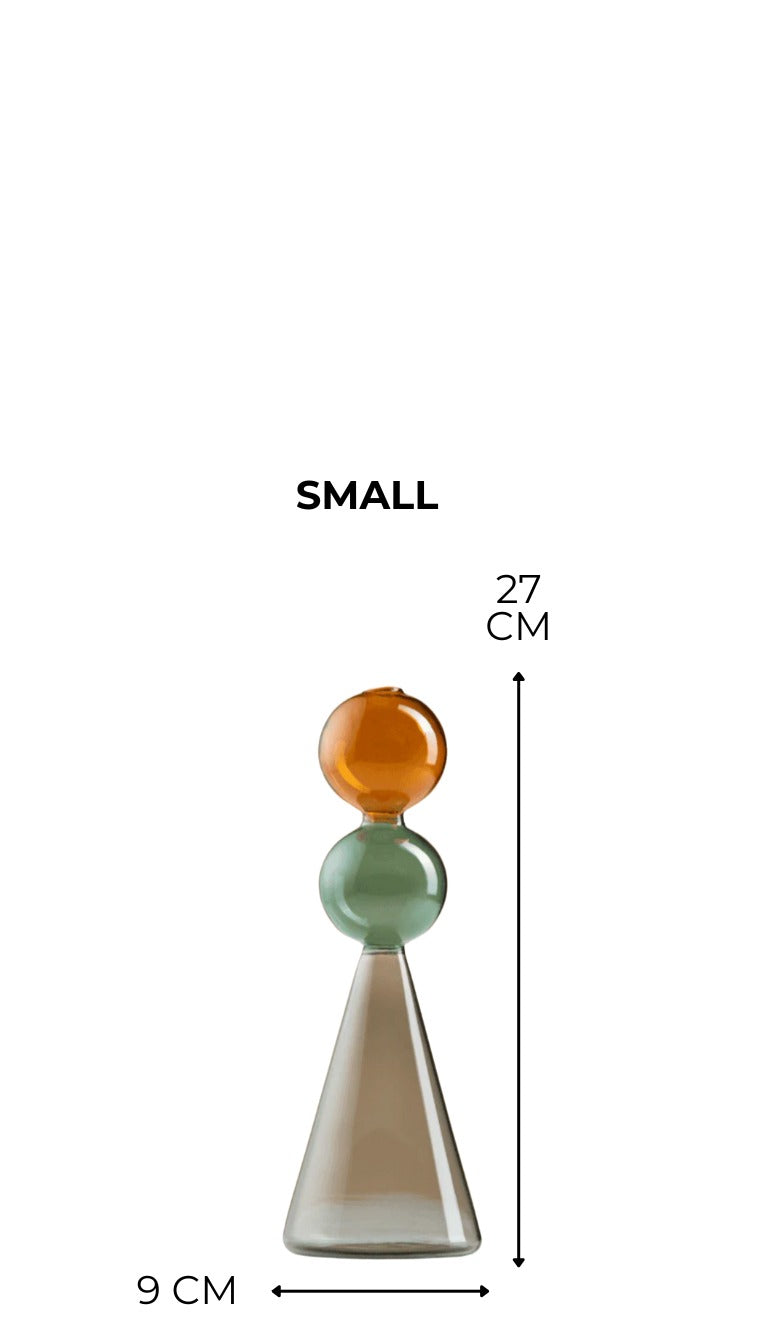 This is an artistic, stacked glass vase composed of three distinct geometric forms. The base is a clear, wide-set conical shape; this supports a translucent, sea-green sphere, which is then topped by a smaller, vibrant amber or orange glass sphere that serves as the vase's opening. The piece is a colorful, gravity-defying sculpture that brings a playful, modernist touch to any decor.
